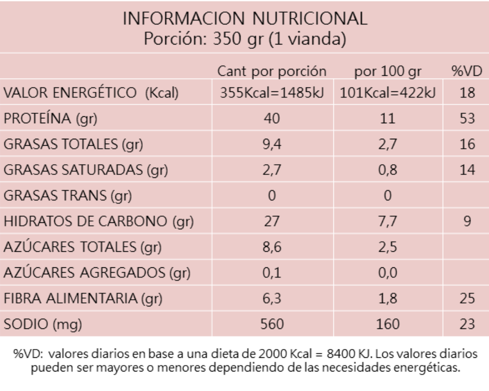Kcal por porción (1 vianda): 355 Kcal