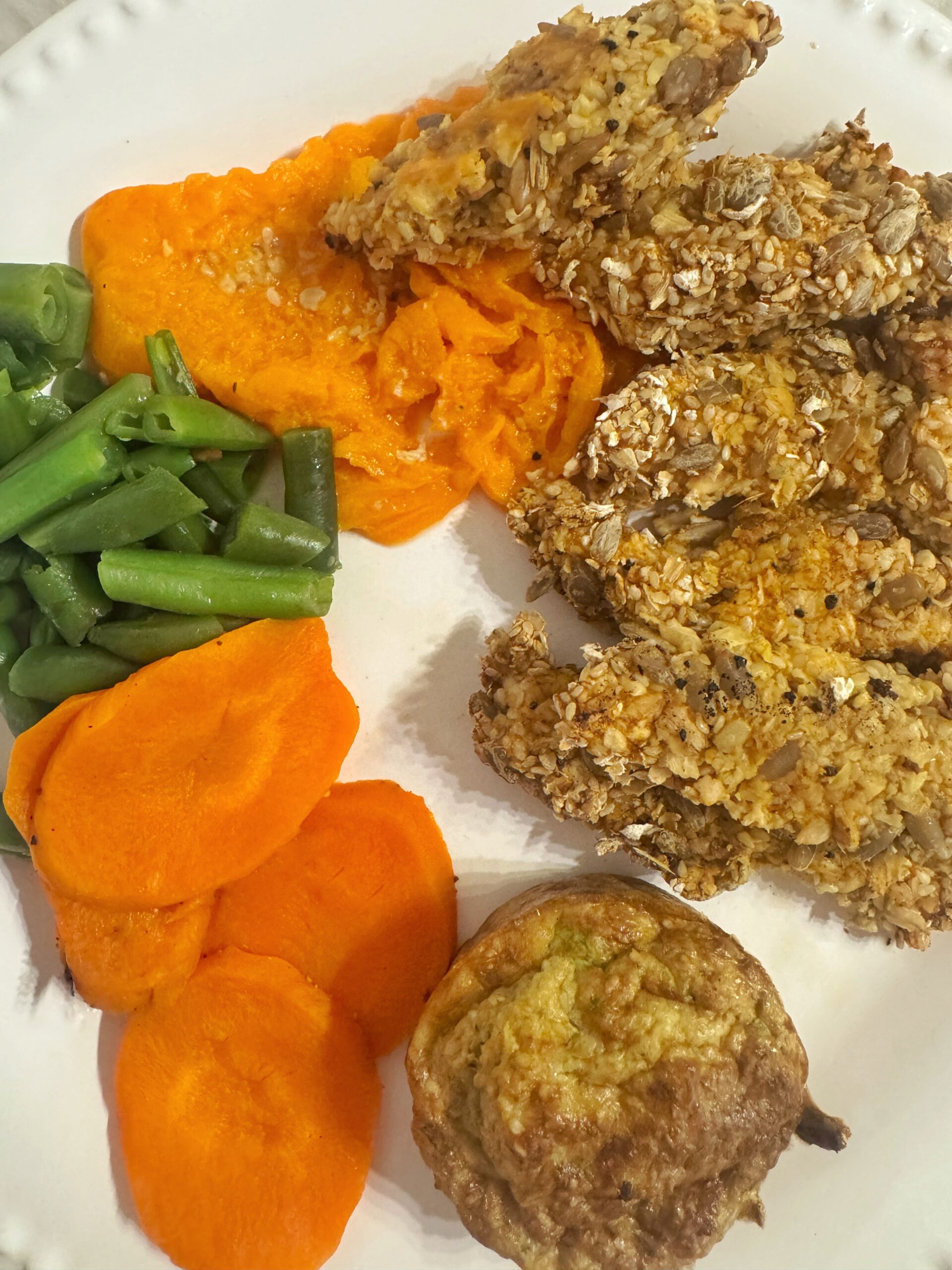 Bastones de pollo (100% pechuga) rebozados en avena y semillas, con una crema de zanahoria a base de una salsa blanca light y puré de zanahoria. Muffins de zucchini a base de queso crema, harina de avena y de garbanzos. Zanahorias y chauchas cocidas al vapor.